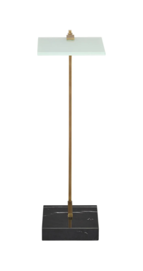 Featuring a sleek frosted glass surface anchored by a striking black marble base, this drinks table marries contemporary elegance with timeless design. An antique brass accent arm adds a refined touch, while the compact proportions and mid-century modern sensibilities make it an adaptable choice for any sophisticated interior. Perfect for intimate spaces that demand both style and function.